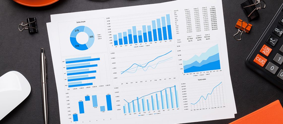 Office workplace table with report page, coffee cup, supplies and computer Flat lay. Top view